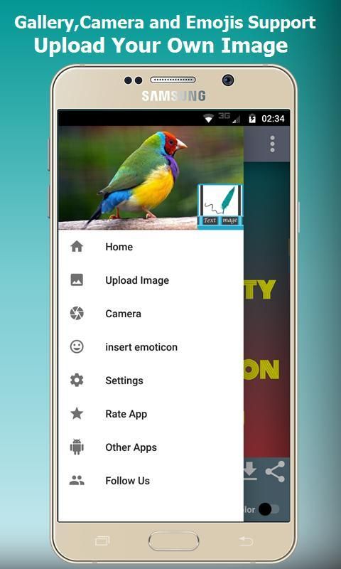 موانئ دبي مصمم الحالة ونقلت صانع، ويحتوي على كاميرا ومعرض الصور تحميل ظائف تمكين لك لتحميل الخلفية المخصصة الخاصة بك. وهذا سوف يساعد بسهولة يمكنك كتابة النص الخاص بك على صور، صور وانشر نقلت ملهمة الخاصة بك، مع العالم من وسائل الاعلام الاجتماعية.