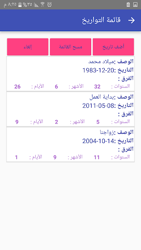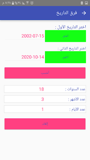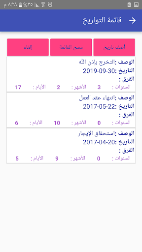 حاسبة التواريخ تقوم بحساب عدد الأيام و الأشهر والسنوات بين تاريخين بكل بساطة وحفظها داخل القائمة بشكل محدث .