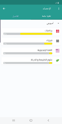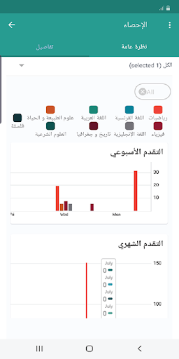 - خاصية الإحصائيات: والتي من خلالها يتمكن التلميذ من تتبع مسار تطور تحصيله الدراسي في كل المواد عن طريق منحنيات التقدم الأسبوعي والشهري.