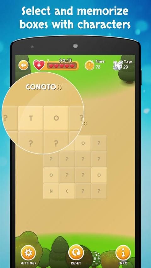 - سوبر الذاكرة يحتاج لك للعب استراتيجية ذكية جدا لحفظ المواقع الدقيقة للصناديق الحرف.