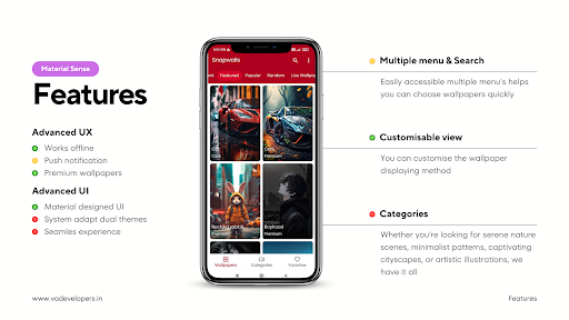 خلفيات لا تصدق.تطبيقنا مليء بالميزات لتعزيز تجربة المستخدم الخاصة بك.استمتع براحة دوران خلفيات التلقائي التلقائي ، مع التأكد من أن شاشتك لا تصبح مملة أبدًا.قم بتخصيص الإعدادات الخاصة بك لجدولة تغييرات خلفيات استنادًا إلى التردد المطلوب ، أو ببساطة دع التطبيق يفاجئك بمظهر جديد في كل مرة تقوم فيها بإلغاء تأمين جهازك.