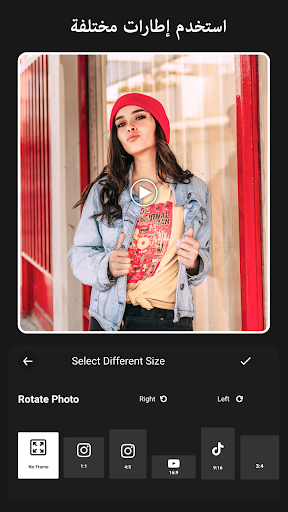 تدعم مقاطع الفيديو التي تم إنشاؤها بواسطة هذا التطبيق نسب عرض إلى ارتفاع متعددة مثل 1: 1 و 16: 9 و 9:16.