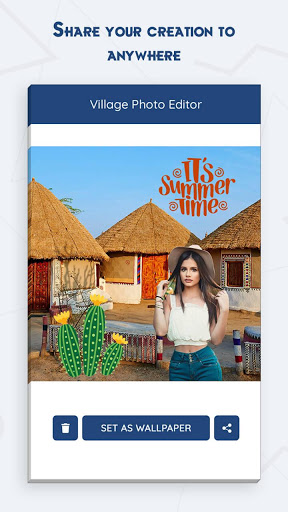 Village Photo Maker and Village Photo Editor is an easy-to-operate app involving a simple procedure like: Selecting a village frame from the various village background photo frames, importing an image from phone memory, modifying the size and shape of the image via the image crop tool and eraser, placing and adjusting the position, size and orientation of the image in the village background photo via simple touch gestures, invoking village-based stickers and variant text to make the village photo more lively and expressive etc.