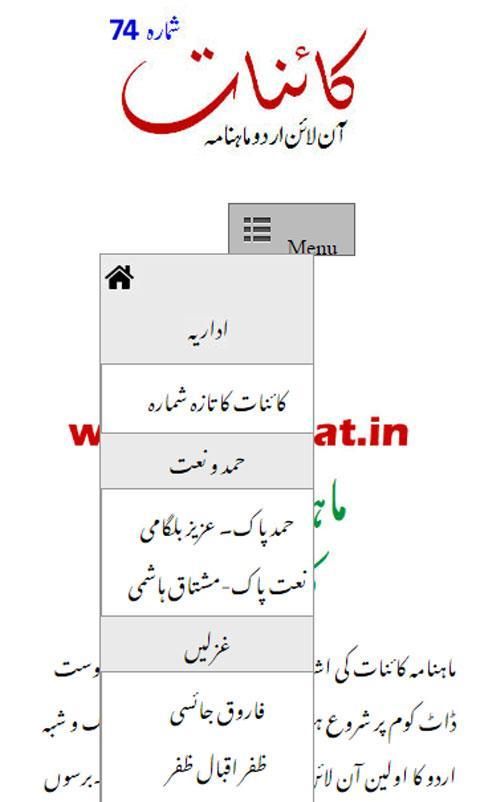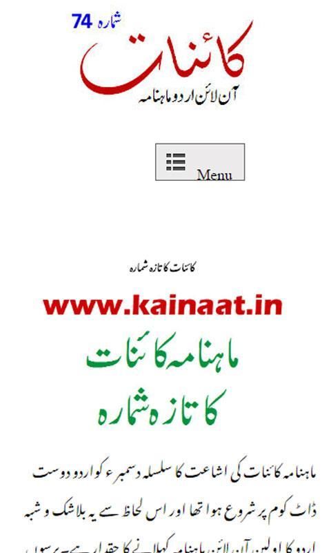 KAINAAT هو الأردية الأدبي مجلة شهرية على شبكة الإنترنت التي نشرت منذ عام 2001 من كولكاتا، الهند. تحريرها والتي تحتفظ بها خورشيد اقبال. هذه المجلة هي مجانية تماما. لا يلزم الاشتراك. مجرد تحميل هذا التطبيق وقراءة مجلة كل شهر مجانا. وتنشر المقالات، الأشعار، الغزل، قصص وما إلى ذلك من الكتاب والشعراء من جميع أنحاء العالم سمعته الطيبة في هذه المجلة.