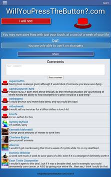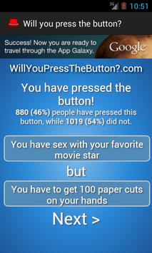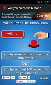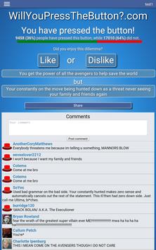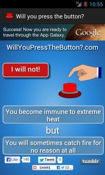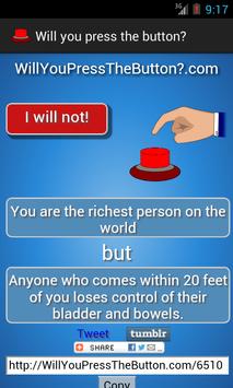 You are presented with a red button. Two things will happen if you press the button - one good and one bad. Will you press the button? It is your choice. Millions of users worldwide! Create, share and comment interesting dilemmas for FREE!