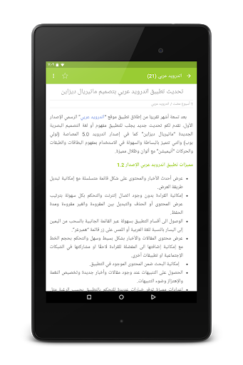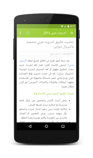 تطبيق موقع “اندرويد عربي” الرسمي لمستخدمي اندرويد العرب، مُتخصص في متابعة نظام تشغيل اندرويد مفتوح المصدر بنكهة عربية؛ عبر تقديم أخبار الهواتف الذكية والحواسب اللوحية والأجهزة والتطبيقات والألعاب، كما يختص الموقع في متابعة أخبار الشركات وأحدث التقنيات التي تقوم بطرحها، ومتابعة التحديثات البرمجية والتطوير لمساعدة المستخدم العربي في الحصول على المعلومة التي يبحث عنها حول أي جهاز اندرويد وكل ما يتعلق به عبر الأخبار اليومية أو التقارير والمراجعات والدروس كتابيًا أوعبر شروحات الفيديو.
