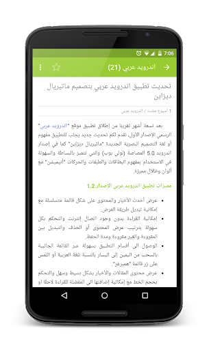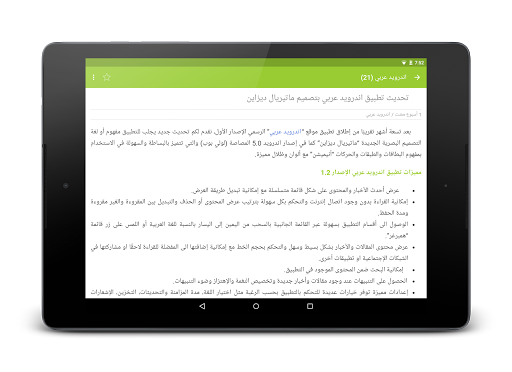- عرض محتوى المقالات والأخبار بشكل بسيط وسهل والتحكم بحجم الخط مع إمكانية إضافتها إلى المفضلة للقراءة لاحقًا أو مشاركتها في الشبكات الإجتماعية أو تطبيقات اُخرى.