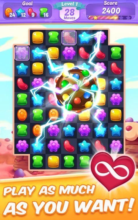 Solve the brain teasers and win amazing bonuses that will reward you with high scores and awesome power-ups. Download this fun and addicting game, match 3 candies, collect items and beat all the challenges. Complete the missions set at the beginning of each level and clear the board. Play today and start working on your matching skills.