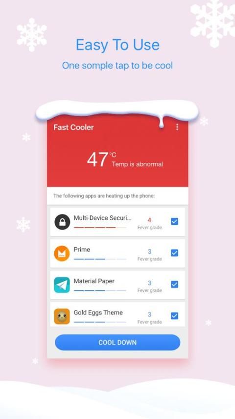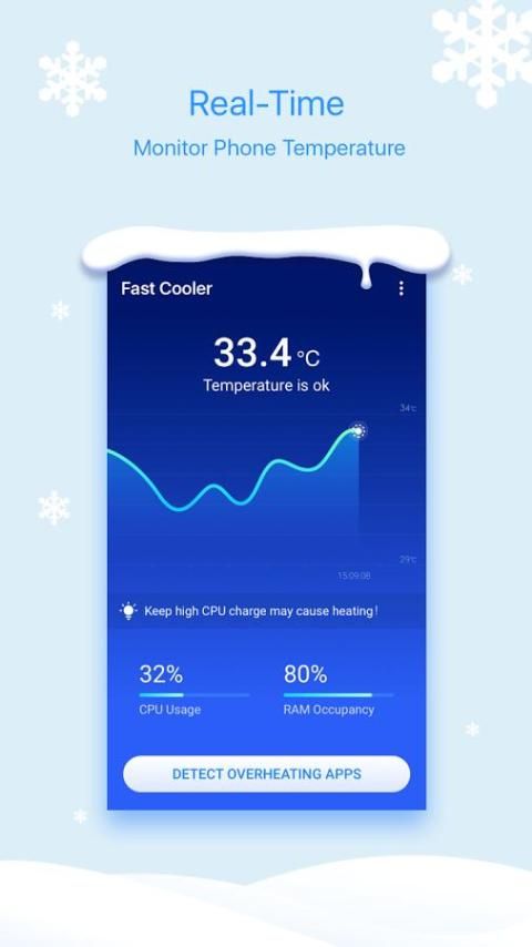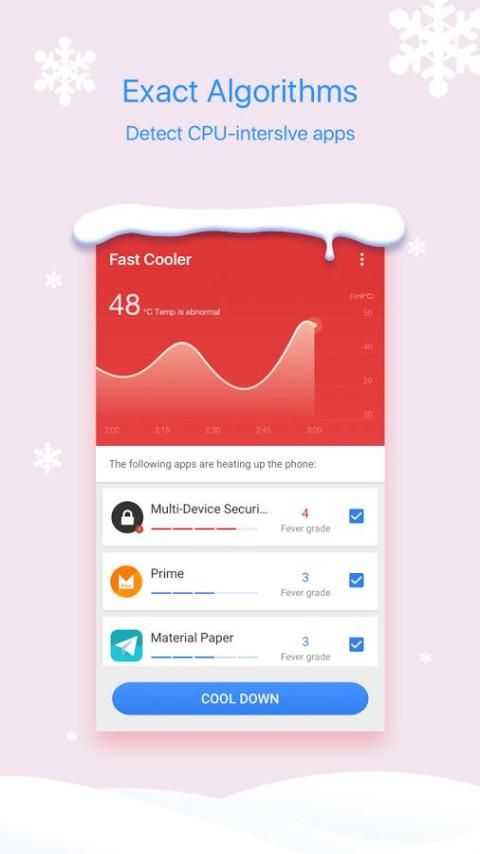 سريع تبريد الهاتف تبريد - مراقبة درجة الحرارة والتطبيق المسيطر أن يكتشف ويغلق الموارد الثقيل تستهلك التطبيقات لتهدئة درجة حرارة الهاتف.