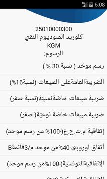 - يمكن استعراض تفاصيل بند التعريفة التي تحتوي على المعلومات التالية (رقم البند مكون من 11 خانة ، وصف البند ، وحدة الاستيفاء ، قيمة الرسوم ، الاتفاقيات التي يخضع لها البند)