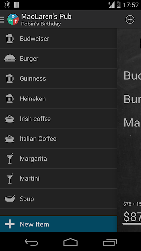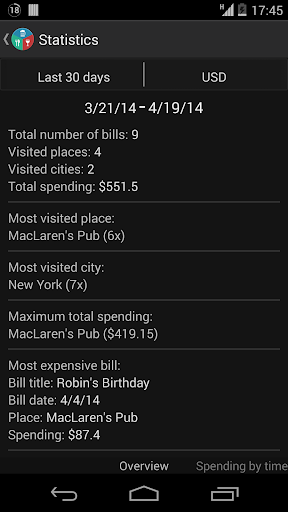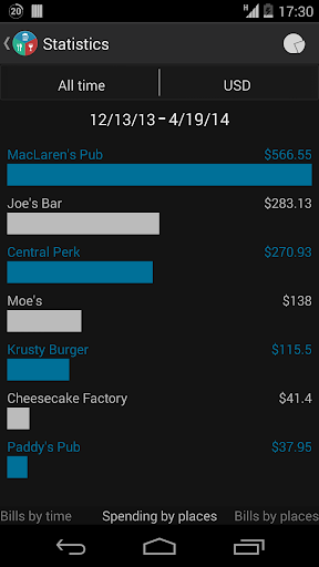 With extensive statistics, keep track of how much you spend for food, how many beers you have drank, where you go most often, where you spend the most money and much more.