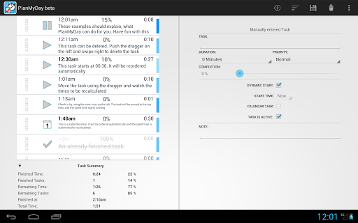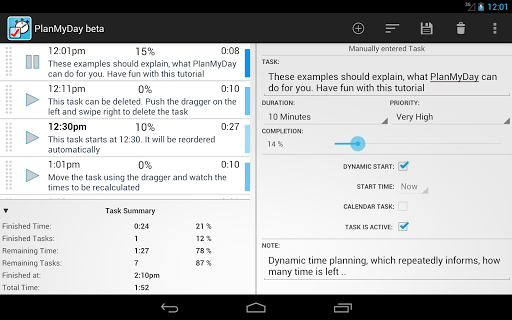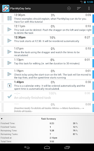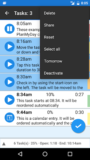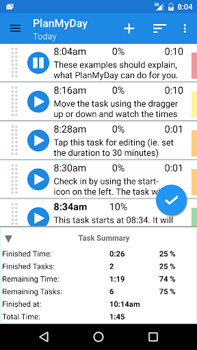 You can check in the current task, i.e. the elapsed time is counted in realtime. At the same time, the time scheduling for the following Tasks gets continuously updated. This makes PlanMyDay the perfect day-planning tool. Also some users which suffer under ADHD use the app to avoid distractions.
