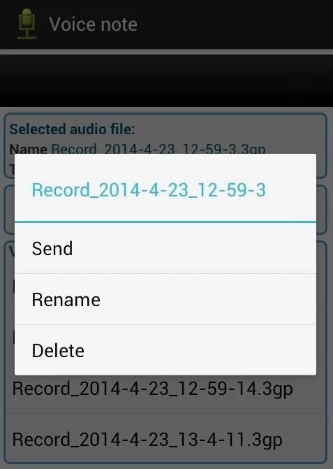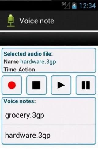 التطبيق هو مجرد تسجيل صوتي بسيط هو أن يتيح لك تسجيل الملاحظات الصوتية. يتم تخزين هذه الملاحظات والملفات الصوتية بصيغة 3GP. مع قائمة السياق كنت قادرا على إعادة تسمية الملاحظات الصوتية المسجلة، وإرسالها عن طريق البريد الإلكتروني أو حذفها.