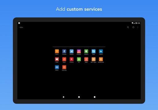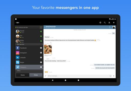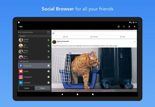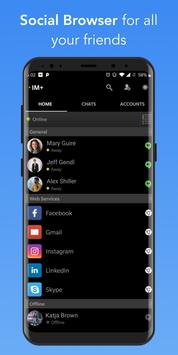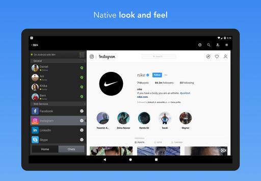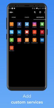 IM supports Telegram, Instagram, Facebook and its Messenger, LinkedIn, Skype, Jabber, and Reddit, between other social networks and messengers - some of them with adblock.