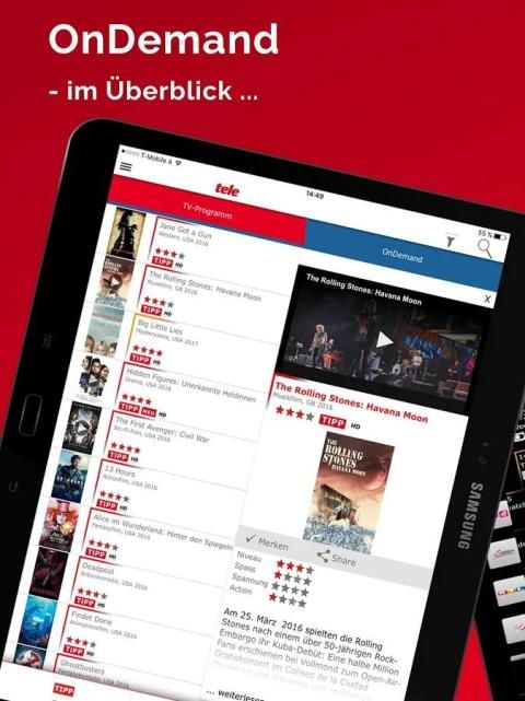 في التطبيق tele.at لدينا وسوف تجد البرنامج التلفزيوني من كل قناة TV النمساوية ORF مثل، ATV، TV Servus أو Puls4، والقنوات التلفزيونية الألمانية مثل ARD، ZDF، Pro7، RTL، كابل 1، الخ. ولكن لدينا أيضا برنامج سكاي كامل على TV -Listing، برنامج الأطفال ومراكز الرياضة والبرنامج الإذاعي من FM4 لO1.