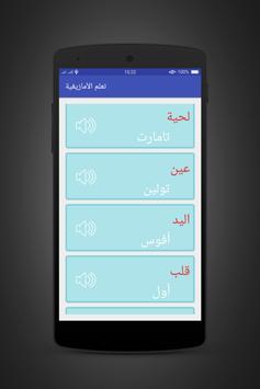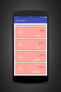 التطبيق تكلم وتعلم الأمازيغية يقدم الكلمات المشهورة باللغة العربية الى اللغة الامازيغية مثل : الاماكن والاكل والارقام والتحية كلها مترجمة الى الامازيغية