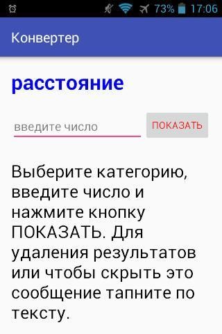 ويشمل تحويل 3 فئات من القيم، وهي الكتلة والمسافة واختيار النقر فئة temperaturu.Nuzhno على التسمية ذات الصلة وأدخل النقر chislo.Posle الخاص بك على زر هو مبين أدناه، يمكنك الحصول على قائمة قصيرة من التحويلات.