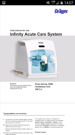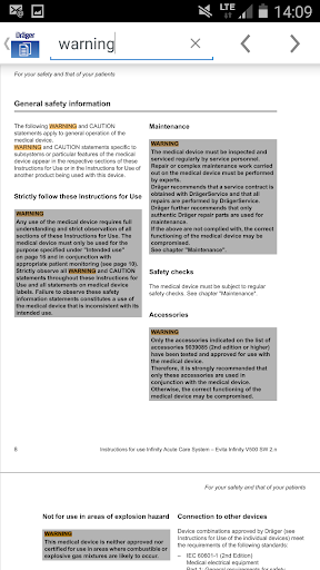 تم تصميم مجموعة المستندات مصممة على قاعدة تثبيت المستشفى المحددة الخاصة بك.لا يوجد المزيد من الأدلة المطبوعة أو المستندات القديمة، يقوم التطبيق بتحديث مستنداتك تلقائيا بمجرد الإنترنت.معلومات منظمة، البحث النص الكامل والاختيار للأجهزة المفضلة أكمل هذا التطبيق.متاح فقط لعملاء Dräger المرخصين (اتصل بممثل Dräger للحصول على مزيد من المعلومات).