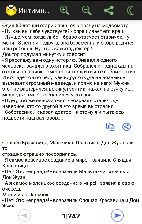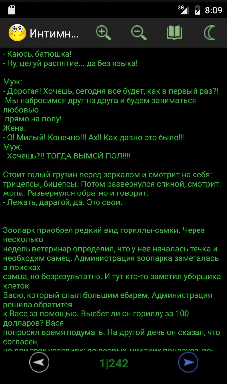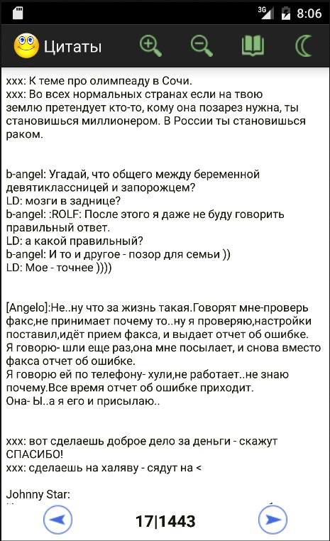 Этот сборник содержит более 130 000 анекдотов и цитат на популярные темы.Работает без интернета. Приложение поддерживает режим "ночного чтения". Приложения запоминает, где вы остановились для каждой категории. Благодаря этому вы сможете позже возобновить чтение с того же места. Сборник включает в себя анекдоты на такие темы: Сборник содержит 130 000 анекдотов на популярные темы.Работает без интернета. 1)Анекдоты о животных, 2)Черный юмор, 3)Сказочные анекдоты, 4)Анекдоты про евреев, 5)Криминальные анекдоты, 6)Анекдоты о Поручике Ржевском, 6)Про женщин 7)Анекдоты о Штирлице, 8)Анекдоты о вселенной WOW, 9)Анекдоты о киногероях, 10)Анекдоты о алкоголиках и многие др..