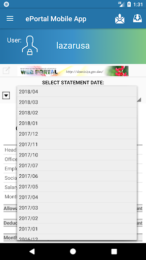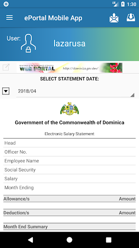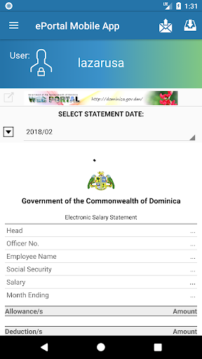 يوفر Eportal نقطة مرجعية واحدة لمراجعة بيانات الرواتب وإجازات إجازة إجازة لموظفي الحكومة.كجزء من سياسة الحكومة الإلكترونية، اتخذت حكومة كومنولث دومينيكا مبادرة رئيسية أخرى في توفير الخدمات عبر الإنترنت لموظفيها.تتوفر الآن Payslips الشهري وأرصدة الإجازات للموظفين الحكوميين عبر الإنترنت يمكن عرض هذه Payslips أو إرسالها بالبريد الإلكتروني أو طباعتها من قبل الموظفين.سيسمح هذا المرفق الجديد بالموظفين الحكوميين بالوصول إلى Payslips الشهري بنقرة زر واحدة وسوف ينقذهم مشاحنات متابعة كتابات الأصوات والزيارات الشخصية لقسم الخزانة.