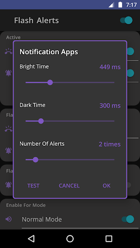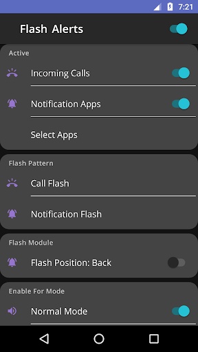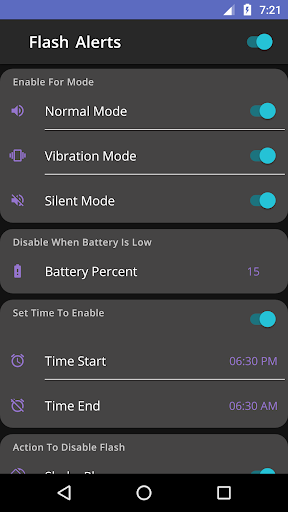في هذه الميزة، يمكنك تعيين الوضع الذي تحتاج إليه وميض الفلاش. الوضع العادي لتنبيهات الفلاش، وميض فلاش عندما يكون هاتفك في وضع الاهتزاز وفلاش ينبهك عندما يكون هاتفك في وضع صامت. يمكنك ضبط كل شيء أو أي حسب الاحتياجات الخاصة بك.