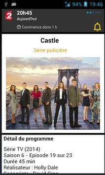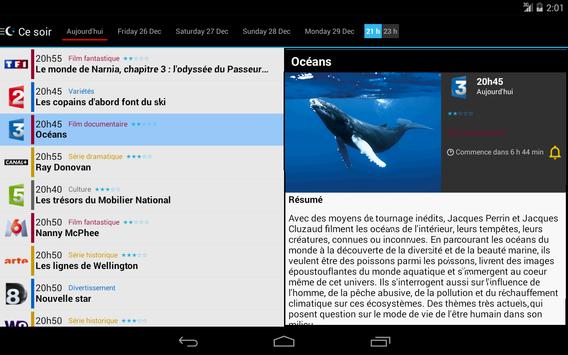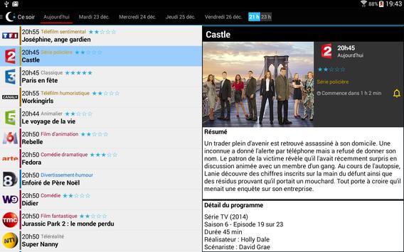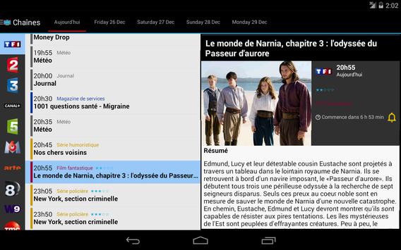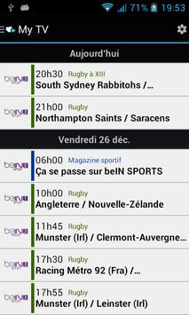Cette application est simple et légère. Avec l'application MyTV, retrouvez les programmes complets des chaînes de la TNT (TF1, France 2, France 3, Arte, France 5, M6, Arte, D8, W9, TMC, NT1, NRJ12, LCP, France 4, BFM TV, I>Télé, Direct Start, Gulli,, France Ô, HD1, L'équipe 21, 6ter, Numéro 23, RMC Découverte, Chérie 25... soit les 25 chaines de la TNT) et toutes les chaines de Canal et de beIn Sport