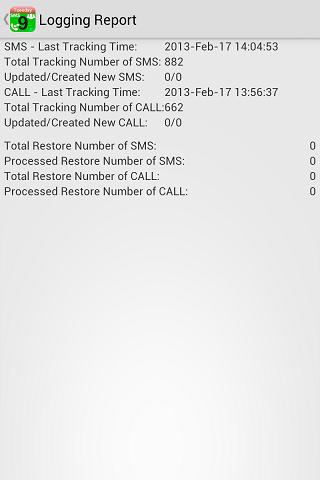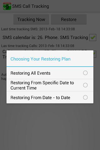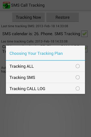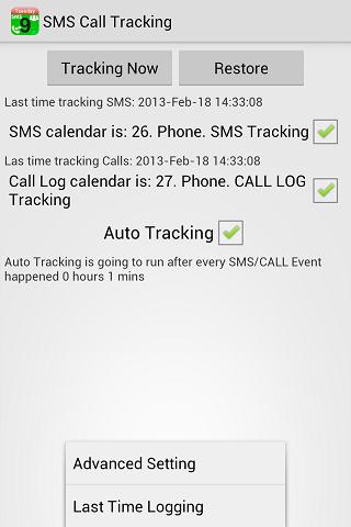 SMS Call calendar Tracking is a program from GiacNguMo group that help people tracking their activities based on SMS and Call Log associated with Google Calendar.With SMS Call Calendar Tracking, you can back up (or tracking) all SMS and Call Log in any phone into your calendars. You even schedule in calendar to send sms in the future.- Firstly, for easy tracking, you should create two new Calendars for store SMSs and Call Logs.- Secondly, you could start the app and select the corresponding calendar for SMSs, Call Logs.- You could set the app for automatically tracking after a custom minutes after an event happened (send/receive SMS, make/receive/miss a call)- With SMS Call Calendar Tracking, user could restore SMS and Call Log from a specific date to another date from the calendar into phones.- It is no problem if you have more than one phone but using a same account and calendar.- Logging screen can help user manage app's activities.- For scheduling sms, choose the calendar where you will create a scheduled sms to send in the future. Then, create a new event with title follow the syntax: sms to contactName (some numbers) = sms's body.For example: sms to Hoang Viet = are you free tomorrow?Please get more details at http://home.giacngumo.com/product/4Your donation will help us improve and keep this app alive, thank you.https://www.paypal.com/cgi-bin/webscr?cmd=_s-xclick&hosted_button_id=BCFLPV4CV3D66