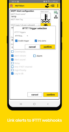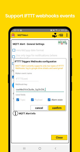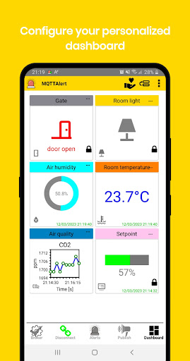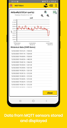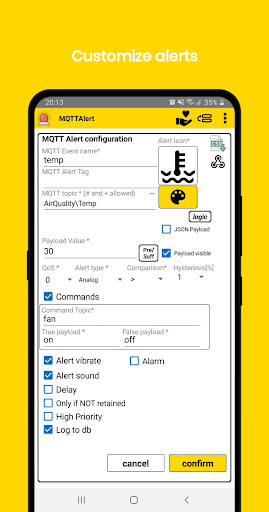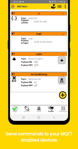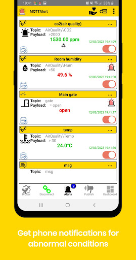 يتيح لك تطبيق MQTTALERT مراقبة أجهزتك للحصول على ظروف قابلة للتكوين (تفتح الباب ، درجة الحرارة و GT ؛ X ، وما إلى ذلك).عند استيفاء الشرط ، ستحصل على إشعار عبر الهاتف أو إنذار صوت تكوين الهاتف.يتم تخزين كل رسالة MQTT المستلمة في قاعدة بيانات محلية يمكن أيضًا تصديرها إلى ملف CSV للتحليل.يتم عرض الحمولات التناظرية أيضًا كسلسلة زمنية.يمكن للمرء أيضًا تكوين كل تنبيه لنشر الأوامر اعتمادًا على حالة التنبيه.على سبيل المثال ، يمكنك نشر أمر MQTT يعمل على تشغيل المروحة عندما تكون درجة الحرارة أعلى من القيمة المحددة وإيقافها عند الإغلاق (مع التباطؤ القابل للتكوين).يمكن أيضًا نشر الأوامر يدويًا من واجهة المستخدم بتنسيقات مختلفة بما في ذلك الصور.يتم دعم حمولة JSON والأوامر المنشورة بالكامل بما في ذلك الحقول المتداخلة والصفائف.يتم دعم الأرقام البرية للمواضيع بالكامل لتنبيهات مرنة أو تكوين الرسائل للأجهزة المتعددة التي يتم دعم MSGPack.تتوفر Dashboard الآن ويمكن للتطبيق الآن دمج بعض أحداث IFTTT ليتم ربطها بالتنبيهات.