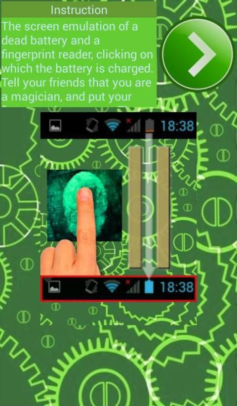 توجيه الاتهام الى المزحة اصبع البطارية - هذا التطبيق يحاكي شحن البطارية بسرعة في الهاتف. يمكنك يسخر من أصدقائك. مضاهاة شاشة بطارية فارغة. أخبر أصدقاءك أنك ساحر، وطاقته لشحن الهاتف. ضع إصبعك على قارئ بصمات الأصابع، وبطارية الزحف فورا من المستغرب جميع المتفرجين! هذه اللعبة سوف يتم شحن الهاتف في الوقت الحاضر، بدلا من ذلك، هو نوعية ومحاكاة واقعية، كل شيء مثل على جهاز حقيقي. استخدم فقط للتسلية.