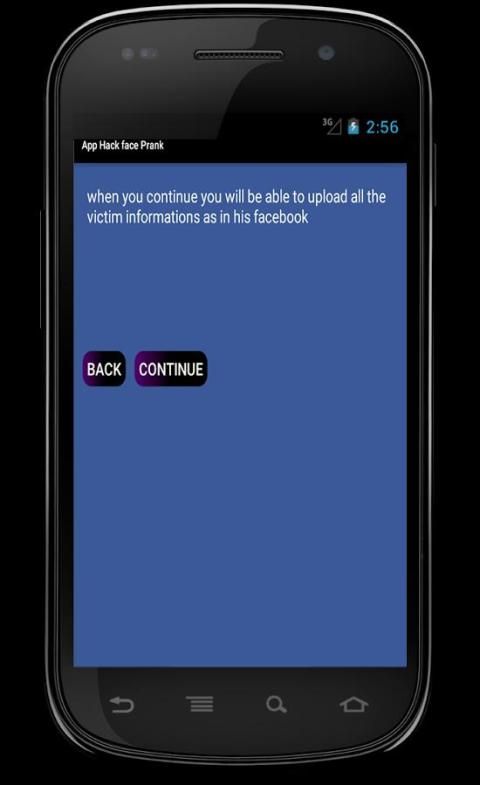 التطبيق عند فتحه تقوم بعملية لاختيار نوع الاختراق ، من أجل أن يظن صديقك أنك حقى تقوم باختراقه ، ولكن في الواقع مجرد مزحة منك، وعد ذلك يامرك بادخال رقم الضحية الوهمية ومعلوماته بعد الثواني من البحث يطلب رقمك و كانه سيعطيك رسائل الفيسبوك وستنظر في وجه صديقك ستراه مندهش لان الكل يخاف من التجسس على الرسائل لما تحتويه من خصوصية .