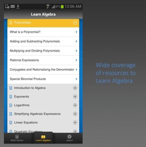 تحتاج الى بعض المواد المرجعية لالواجبات المنزلية؟ هذا التطبيق لديه متعة لتعلم الموارد الجبر. ويغطي هذه المواضيع: