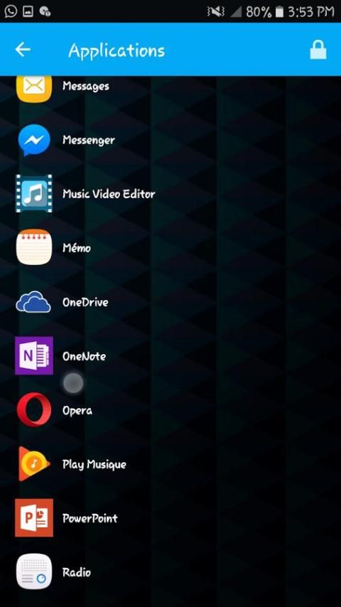 هذه التطبيقات يمكن قفل MMS، اتصالات، أوبرا، SMS، vidoi الحب، الفيسبوك، إينستاجرام، معرض، واتس اب، Speaky، fichiers مس، راديو، Appareil الصورة، الإنترنت، مذكرة، مذكرة، الملاحظه ،، وسائل الاعلام الاجتماعية، هاتف، اتصالات، رسائل ، إعدادات، ووتش، الصوتية، تسجيل المكالمات، المكالمات وتطبيق اخترت، وحماية خصوصيتك من كور