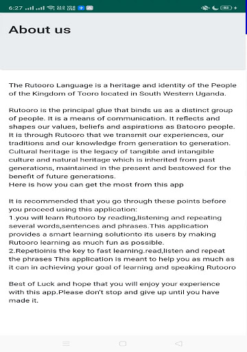 Rutooro هو الغراء الرئيسي الذي يربطنا كجماعة مميزة من الناس.إنها وسيلة اتصال.وهو يعكس ويشكل قيمنا ومعتقداتنا وتطلعاتنا كأشخاص بطن.من خلال Rutooro أن نحيل تجاربنا وتقاليدنا ومعرفتنا من جيل إلى جيل.