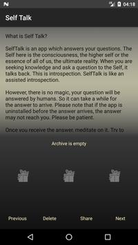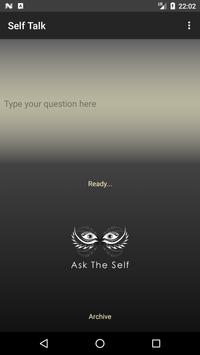 Self Talk is an app which answers your questions. The Self here is the consciousness, the higher self or the essence of all of us, the ultimate reality. When you are seeking knowledge and ask a question to the Self, it talks back. This is introspection. Self Talk is like an assisted introspection.