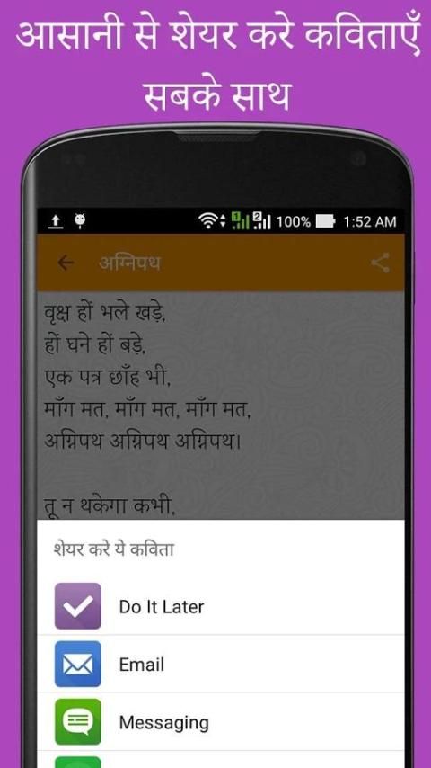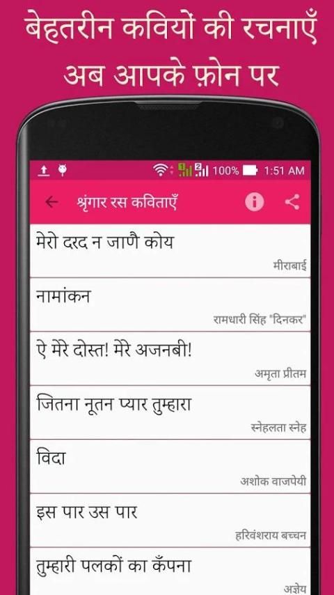 हिंदी कवितायेँ الهندية كافيتا هو التطبيق لالهندية كافيتا (الشعر) قصيدة Lovers.This التطبيق يحتوي على قصائد من أسماء معروفة ومشهورة الهندية الشعر. سيتم إضافة المزيد الهندية قصائد ومميزات رائعة مع مرور الوقت. دعونا لا ندع هذه القصائد التي فقدت في التاريخ.