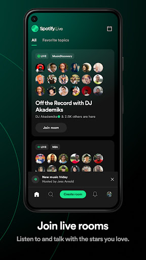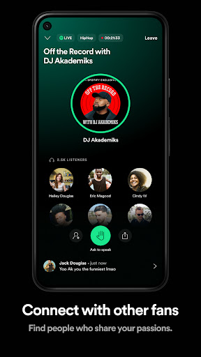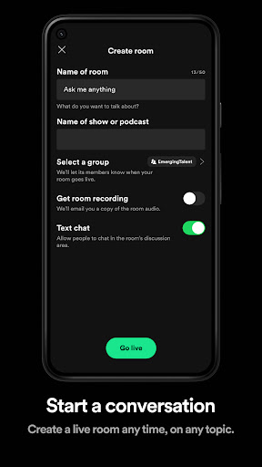• يمكن تحويل المحادثات الحية إلى بودكاست للأشخاص للاستماع مرة أخرى إلى لاحقًا. احصل على التطبيق مجانًا ، وقم بالتسجيل أو قم ببساطة بتسجيل الدخول باستخدام حساب Spotify المعتاد!