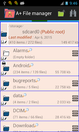 - browse not only the content of the external memory that contains the public folders and files, but also the entire file system,