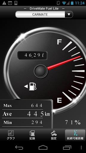 · من خلال تحريك مؤشر مقياس الوقود في التطبيق، يمكنك التحقق من المسافة إلى الوقود فارغ والتي يتم حسابها من قبل المتوسط المسجل، الحد الأدنى، أقصى قدر من كفاءة استخدام الوقود