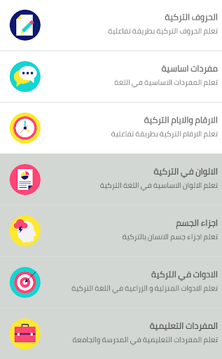 تعلم التركية مجانا هو تطبيق يساعدك على تعلم التركية بسهولة ومجانا، يتؤفر التطبيق على العديد من المفردات والجمل والقواعد الاساسية للغة.