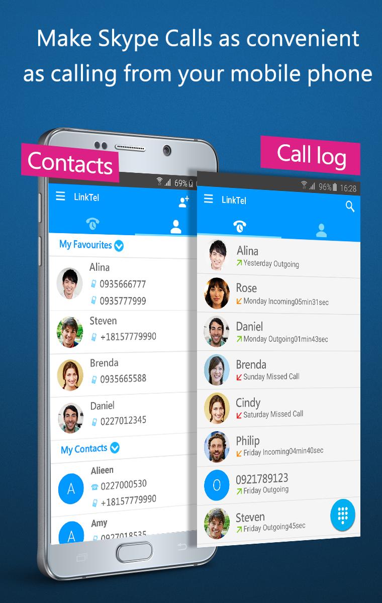 Without looking for the dial pad in Skype App, you can use LinkTel to make SkypeOut calls directly. The home screen consists of your call log and contact list. You can easily return a missed call from your call log or simply enter any number to call whether it's a mobile, landline, international. It’s all at your fingertips!