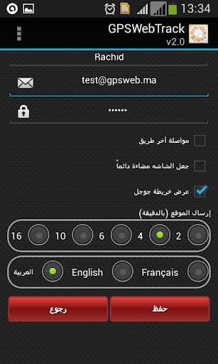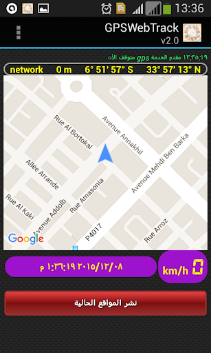 التطبيق GPSWebTrack يمكنكم من إرسال، عبر الانترنت و بتردد متحكم فيه، مواقعكم إلى سيرفر الويب الخاص بنا حيت سيتم الاحتفاظ بها. حينما تفقدون الاتصال بالأنترنت سوف تخزن كل مواقعكم على الهاتف. بمجرد استعادة الاتصال يمكن ارسلها تلقائياً أو بالنقر على زر.