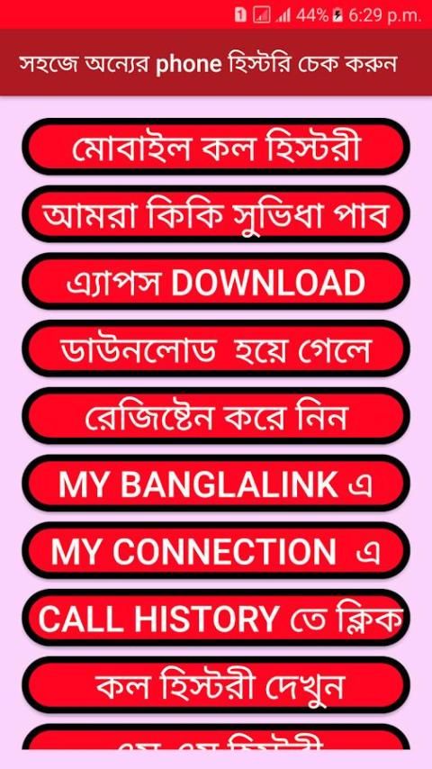 আপনারা হয়ত প্রথমে দেখে বুঝতে পেরেছেন যে، অ্যান্ড্রয়েড এ্যাপস দিয়ে কল হিস্টরী চেক করা যাবে. তো আমরা ... এই বার আপনি যে নাম্বার চেক করবেন সেই নাম্বার এর মেসেজ অপশনে গিয়ে টাইপ করুন REG এবং পাঠিয়ে দিন 9876 নাম্বারে. ... এবার এ্যাপস টা ওপেন করুন، এবার আমি আপনা দের জন্য তৈরী করে রেখেছি নিচে দেখুন.