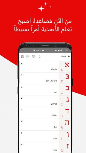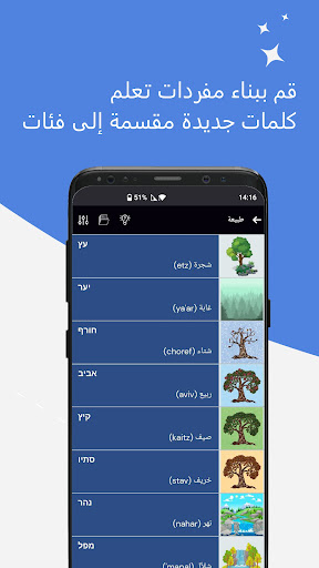 تطبيق مجاني لتسهيل دراسة اللغة العبرية ، موزًعة حسب الفئات لاستعمال أسهل.