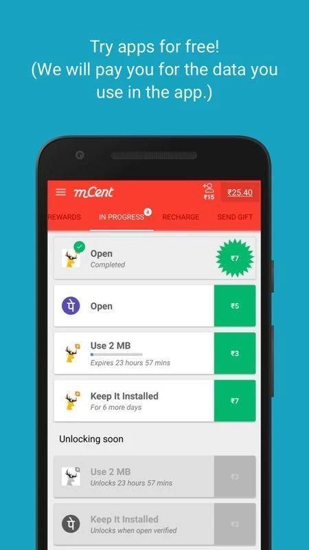 3. استخدام الائتمان لإعادة شحن الهاتف مجانا! كسب المال مجانا شحن على mCent اليوم الأول وكل يوم بعد ذلك. يمكنك استخدام البيانات فراغك يعيد شحن أي حال كنت تريد. زيارة أي موقع ويب تريده، تنزيل أي برنامج، أو إعطاء التغذية للأصدقاء. تقلق أبدا رسوم البيانات مرة أخرى. ويدعم إعادة الشحن المحمولة على جميع المشغلين الرئيسيين.