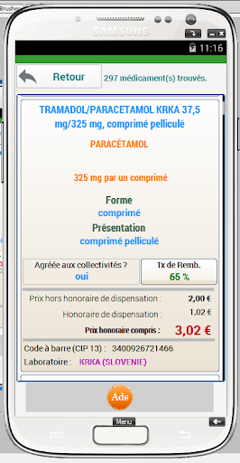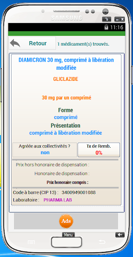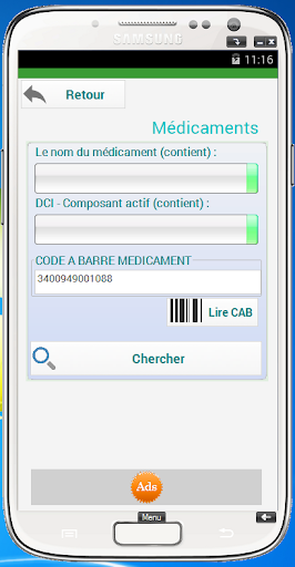 لا يسمح لك أي حاجة إلى اتصال بالإنترنت، بمجرد تنزيل هذا الحل المجاني عرض جميع الأدوية المتوفرة في فرنسا، مدرجة بالاسم والمكون النشط، يمكنك تحميل قابس الدواء فقط عن طريق مسح الرمز الشريطي ...