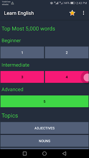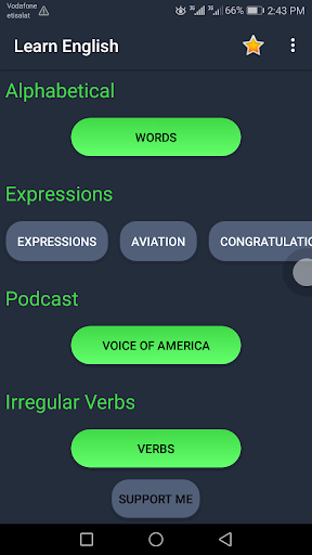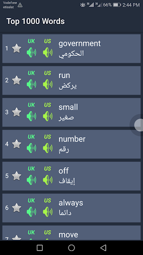 بحتوى التطبيق على كثير من كلمات اللغة الانجليزية اكثر من 15 الف كلمة مرتبين بحروف الهجاء الانجليزية