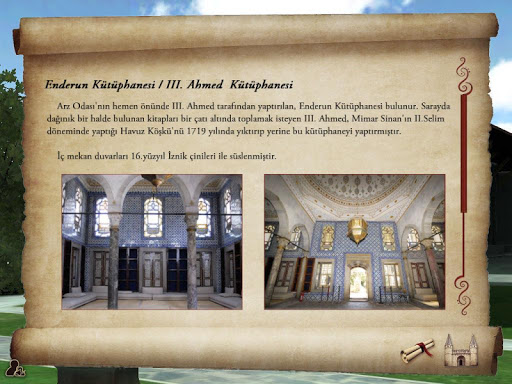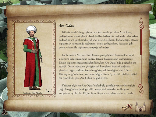 مع تطبيق Topkapi Palace 3D، ستتمكن من التحكم في قصر Topkapi على النموذج ثلاثي الأبعاد، فستتمكن من فحص الزوايا التي لا يمكنك رؤيتها من الزوايا التي لم ترها من قبل، ستتمكن من ذلك احصل على معلومات تفاعلية حول ساحة Divan Square و Renderun Courtyard and Sofa-I Humayun.