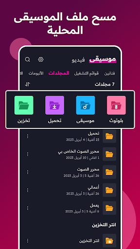 ⭐ مسح ملفات الموسيقى محليًا وإدارة الموسيقى حسب المجلدات والفنانين والألبومات والأنواع وقوائم التشغيل.