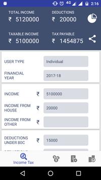 Income Tax Calculator is an app that helps you calculate payable tax for your income you earned. It helps you calculate IT Return using Income from Salary, Income from House Property/Rent, Income from Other Sources, Income from STCG (Short Term Capital Gain) and Income from LTCG (Long Term Capital Gain). Deduction covered here are 80C, 80D, 80DD, 80EE, 80TTA. Tax preparation is very easy using this Income Tax calculation app. It provides you with free tax preparation help. You just need to enter all of your income and deductions to be made from the income. The app will automatically tell you the amount of tax payable. Online Income Tax Return Filling will be so easy using this app. Tax record summary can be shared via email.