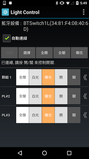 使用 Android 手機或平板電腦, 以藍牙無線功能遙控燈具, 輕鬆調整亮度及顏色。本 APP 須搭配指定的燈具。 APP 提供中文版本, 安裝在繁中手機上, 即可自動顯示在地 (台灣) 中文。